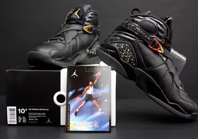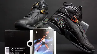 This time around, the "Cigar and Champagne" Pack features one white Air Jordan 8 and one black Air Jordan 8, with the latter featuring confetti inspired accents, hence the name.