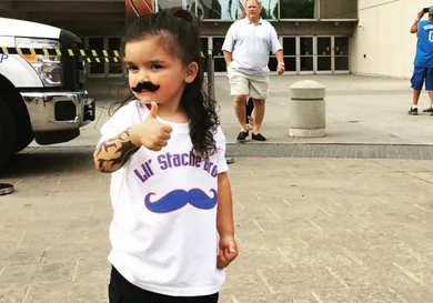Introducing, "Lil Stache Bro" the young girl who has the hair, faux moustache and temporary tattoos that have her looking like Steven Adams' mini-me.