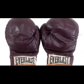 After cutting them off after the fight, in which Ali lost after 15 rounds, trainer and cornerman Angelo Dundee brought them home, where they remained until his death in 2012. The interior of the Everlast gloves are labeled and signed by Dundee.