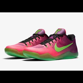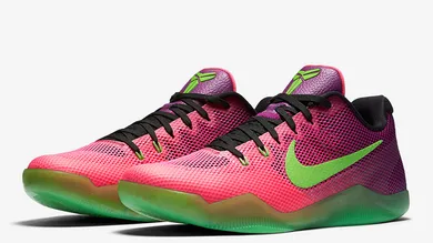 This year's "Mambacurial" Nike Kobe 11 is no different from that iconic pair, featuring a vibrant, eye-catching pink design accompanied by hits of electric green. The gradient of the upper shifts from pink flash to a deep red plum on the heel and includes big, bold "NIKE" branding which is another similarity to the classic Kobe 8.