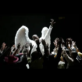 Yeezus ain't quite Jesus, as evidenced by his inability to walk on water in Armenia. In late 2013, though, during the opening show of Kanye's "Yeezus" tour in Seattle, he brought out a Jesus impersonator and asked, "White Jesus, is that you?" Kanye himself was dressed in a less modest getup, donning a floor-length velvet robe and a pair of red Air Yeezys, with a mask of mesh armor covering his face. "I told you I've been here the whole time," said White Jesus, prompting Yeezus to remove his mask.