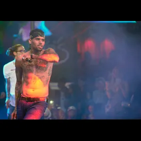 First, Brown begins acting out the lyrics of "Take You Down," humping the stage with ultimate pelvic propulsion, and he then removes his shirt and inches toward the fan who's positioned as if she's ready for whatever comes next. (He does all this, mind you, while his hype man removes his own shirt and proceeds to personify the very definition of "sus"). Brown then goes in for the kiss and gets dangerously close before backing away. Though he withheld the mouth-to-mouth, he saved some tongue action for the girl's knee. And though the knee was an unexpected target, the fan looked like she could've handled plenty more where that came from.