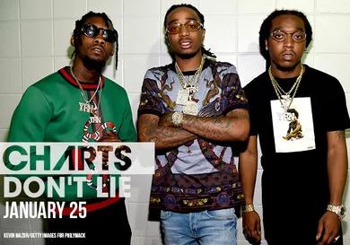 "Bad and Boujee" remains a huge success as Migos and Lil Uzi Vert take the #1 spot back from Ed Sheeran, who dethroned them last week. Rae Sremmurd and Gucci Mane are at #3 with "Black Beatles" and The Weeknd is at #5 with "Starboy." Machine Gun Kelly, Kendrick Lamar, and Bruno Mars are also in the top 10, while Drake is just outside at #11 with "Fake Love." The Weeknd and Daft Punk's other hit "I Feel It Coming" breaks into the top 20 for the first time, while D.R.A.M.'s "Broccoli" bounces out of the top 20 and lands at #21. KYLE and Lil Yachty's "iSpy" climbs from #42 to #32, its peak position. Elsewhere, PARTYNEXTDOOR has a new one coming in at #95 called "Not Nice."