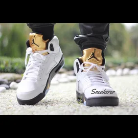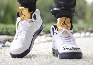Officially called the Air Jordan 5 Retro “Olympic,” Jordan Brand differentiates this Olympic sneaker from its many others by staying monochromatic. No traces of blue or red appear, as the upper is predominantly white with a black midsole. The tongue is a a metallic gold, with gold also appearing as an accent on the midsole. Despite disappearing from a few future retros, the blue icy sole is still present on this Air Jordan 5.