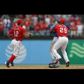 In the finale of their three game series, Bautista took a hard slide into second base and the Rangers' Rougned Odor was not pleased. And when I say "was not pleased," I mean, "he lost his sh*t and hit Bautista clean on his jaw."