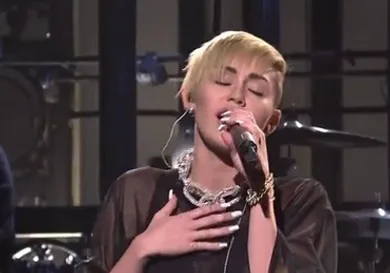 Miley Cyrus both hosted and appeared as a musical guest on SNL last night. One of the songs she performed was "Wrecking Ball", the live set being considerably tamer than the music video.