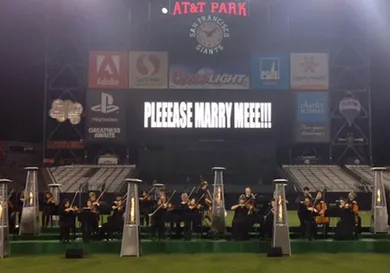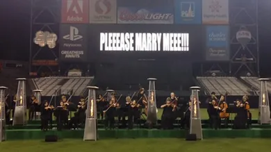 Footage of Kanye West's marriage proposal to Kim K on her 33rd birthday has emerged. Watch the rapper (from a distance) get down on one knee and pop the question, backed by an orchestral band. Following that there is some footage of the two with family and friends at the stadium, as they celebrate.