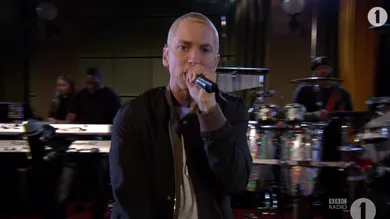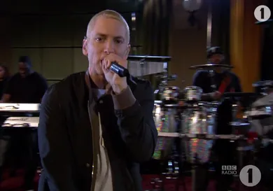 Eminem takes his "MMLPII" single to the BBC 1 studios.