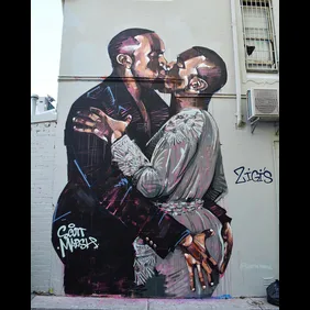 A bit of background about the mural. It’s based on a photoshopped picture of Kanye West kissing Kim Kardashian that replaced Kim’s head with her husband's. Obviously, this is hilarious, and Kanye didn’t really pay it any mind until it went viral as a physical art piece.