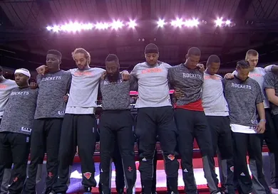 Prior to last night's pre-season game between the Knicks and Rockets, players from both teams stood side by side with their arms around each other for the singing of our National Anthem as a show of solidarity.