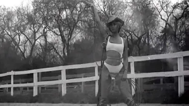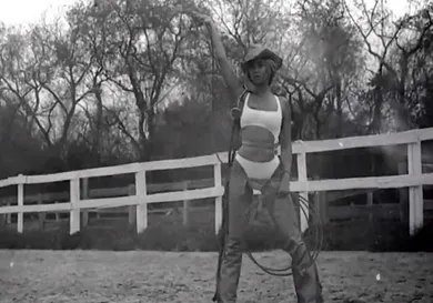 Queen Bey decides to play up 'Ye's cowgirl innuendos, getting suited up in the full uniform, including hat and lasso. We don't get any footage of Yeezus, but his verse plays for the duration of the trailer.