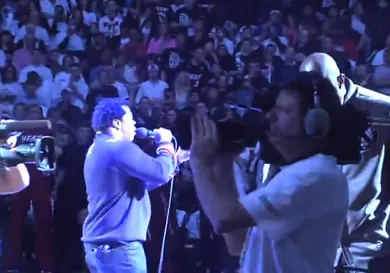 Similar to Fabolous' introduction of the team last week, the NYC rapper stood at half court reading aloud names to tumultuous applause. Rhymes' booming voice proved perfect for the task of announcing, making us wonder if he'd ever consider taking a job in sports television.