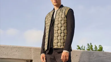 o a Transition Vest with woven nylon fabric and brushed softshell fabric, welded down fill and smart pocketing ($199)