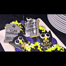 As seen on a photo that LeBron posted to his IG, the tombstone shaped cookies on the dessert table read "Klay Thompson 2015-2016" and "Stephen Curry 2015-2016" with a nice "splash emoji" design at the very top of their headstones.