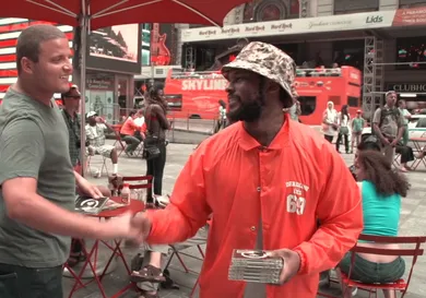 Clearly, some people recognize him and shell out the $10 for the CD, no questions asked. But more often, he's met with the indifference that New Yorkers tend to have for people selling things on the street. A funny clip to say the least.