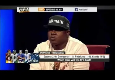 Jadakiss' gravelly voice may not scream "TV host," but someone evidently wanted to hear the NYC MC speak his mind on ESPN, because he turned up on the network last night. Visiting the network's First Take program, hosted by Stephen A . Smith and Skip Bayless, Jada gave his predictions on the NFC East and mourned his hometown Giants' woeful performance thus far.
