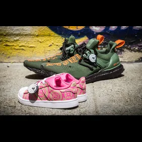 For Kanye, a "half un-caged" pair of Adidas Ultra Boosts decked out in forest green with orange Pablo-style text. For North, a pair of pink and gold Adidas Superstars painted with compasses pointing North & West.