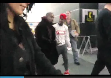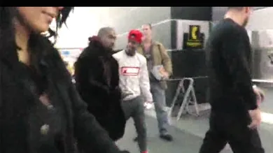 As Kanye West, Kim, and baby North walk out of the arrivals exit at JFK airport this morning, 'Ye is ready for the paparazzi that's eager to get the scoop on his post-Grammy theatrics.