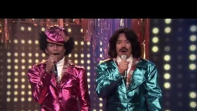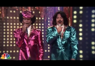 Dressed impeccably well for the part, Pharrell dons a fro wig and a shiny pink suit while shimmying next to Fallon, who looks like he just changed clothes from his Barry Gibb outfit, keeping the wig and facial hair. Pretty funny stuff.
