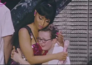 Nicki Minaj's incredible raps can usually turn that frown upside down, but it wasn't her music that provided comfort for a young fan at her recent Belfast show. Donny, a kid who can't be older than ten years old, was invited on stage at the show, and while he first greeted Nicki with hysterical crying, he had a sudden change of heart when Minaj pressed him against her chest.