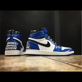 The custom 1s feature a royal and black patent leather atop the white leather upper, with Smackdown branding on the heel. The finished product is looking pretty slick but Shane O'Mac needs to find out a new way to rock these because it looks like they're cutting off circulation to his feet.