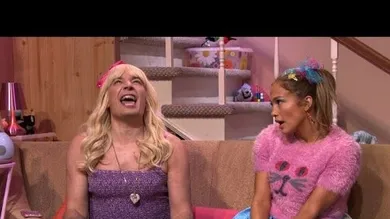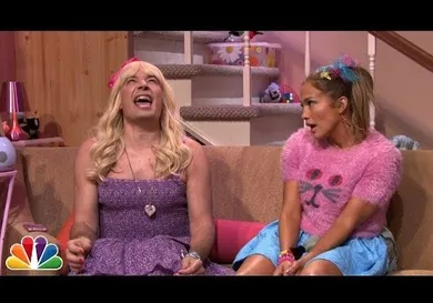Dressing up as a tween version of herself (Fallon too), the two take Snapchats with each other and overuse the word 'ew.' The best part comes in the form of J. Lo twerking to Rihanna's new single "Work" before being interrupted by a very uncool step-dad.