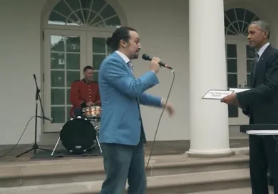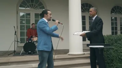 Lin-Manuel Miranda was backed with just a drummer as he rapped a freestyle dictated by the words that President Obama revealed via cue cards. “I did not see those words prior,” Miranda clarifies after he gets dapped up by Barry O at the end of the video. It might be quite a few years before we get to hear the Commander-in-Chief say the words, “drop the beat.”