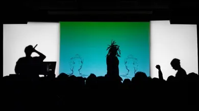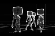 Shot during their live “beta show” in Chicago, the “footage represents the core concept of the live show, which is to say that no matter where you go you can’t escape your own self imposed limitations. the box/screen we’re trying to escape is also the only means of escape. it’s a constant battle for self awareness”