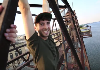 His latest stunt took him to an abandoned power plant in an undisclosed location, where he goes acapella while dangling from a giant bridge, grinning from ear to ear as he makes the insane look effortless. If you're palms don't get sweaty watching these types of videos you probably don't have a pulse.