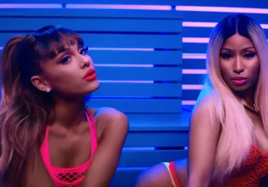 After performing the track during the VMAs tonight, Ariana Grande and Nicki Minaj have now shared the video to their collab "Side to Side," which appeared on Grande's Dangerous Woman, released in May. The video begins with Grande leading a highly arousing spin class, before she heads to the sauna to catch up with Nicki and a group of live Ken dolls. Scintillating performances from both women.