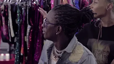 The only thing more memorable than the music on Jeffery is the project's cover art, showing Young Thug in a floor-length blue dress that resembles a luxury mop and a conical hat obscuring his head that looks like a blown-up cocktail umbrella. It turns out that Thug handpicked the bizarre getup himself. Right when he saw it, he knew he'd found the perfect look for Jeffery. In a new video shared by VFILES, one can see that very moment.