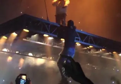 Kanye West’s floating stage has been the highlight & focal point of his Saint Pablo Tour, having received great reviews & write-ups from publications like Rolling Stone, USA Today, & Billboard to name a few. Well on Monday night in ATL, one crazed fan thought it would be a smart idea to try & climb the stage, which as you know probably didn’t work out in his favor.