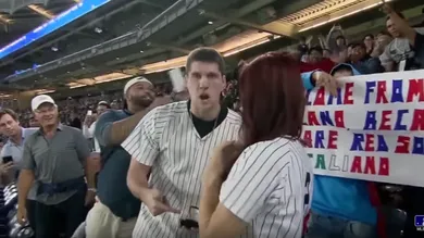 During the 5th inning of last night's Yankees v Red Sox game in the Bronx, Yankees fan Andrew Fox decided to pop the question to his girlfriend, Heather Terwilliger. The cameras were rolling, the fans were on their feet, and then Fox dropped the engagement ring... and then he couldn't find it anywhere and the moment quickly shifted from excitement to sheer panic.