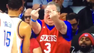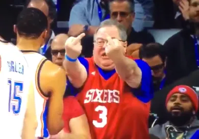 A Philadelphia Sixers fan was ejected from tonight's game for giving a powerful double middle finger salute to Russell Westbrook. It was a triumphant gesture that earned him a trip to the parking lot of the Wells Fargo Center.