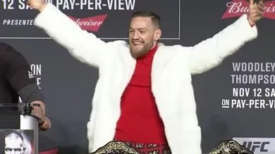 McGregor, the current UFC featherweight champion, showed up fashionably late in a gaudy fur coat, stole Eddie Alvarez's lightweight title and said, "Sorry I'm late, I just don't give a f*ck."