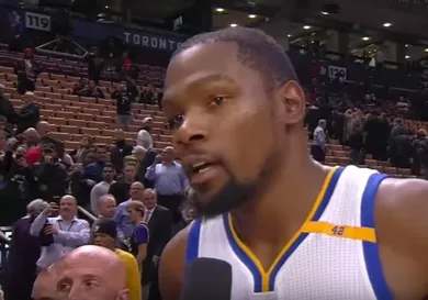 After Golden State's 127-121 victory over the Toronto Raptors on "Drake Night," the guest of honor went out of his way to bump into Kevin Durant during KD's post game interview, which prompted a question about their trash talk throughout the game.