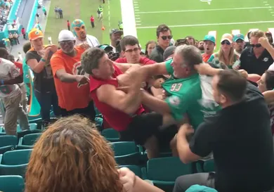 During yesterday's game between the Miami Dolphins and San Francisco 49ers at Hard Rock Stadium in Miami, a brawl broke out between two (presumably) drunk Dolphins fans and a couple of 49ers fans in section 334.