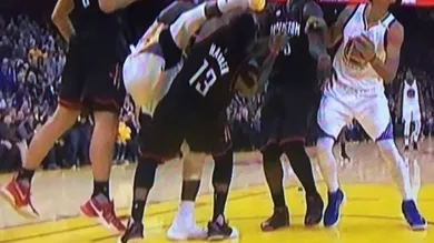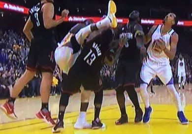 Last night's Rockets vs Warriors game went into double overtime, giving Draymond Green an extra 10 minutes to deliver his finishing move. This time, James Harden was on the receiving end of Draymond's karate kick which struck him upside the head.