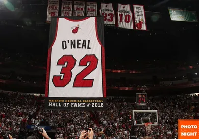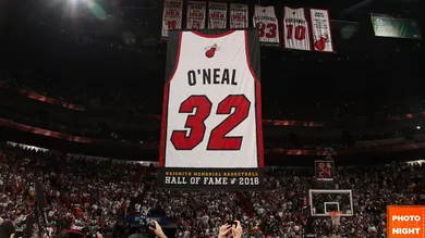 Last night in Miami, during halftime of their game against the Lakers, the Heat raised Shaquille O'Neal's #32 jersey into the rafters, joining former Heat legends Alonzo Mourning and Tim Hardaway. The Diesel helped deliver Miami's first championship alongside Dwyane Wade in 2006, and in honor of Shaq's nickname the organization gifted him with a miniature semi-truck which was driven onto the court by his mother.