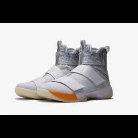 The John Elliott x Nike LeBron Zoom Soldier 10 sport a light grey built, accompanied by a marble looking graphic on the ankle strap, a splash of orange about the toe and a glow in the dark sole.