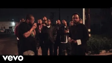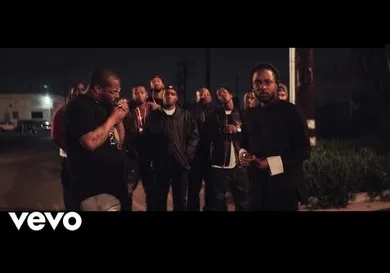 "DNA." suddenly kicks in and Cheadle's character becomes possessed, rapping the words along and trading bars with Kendrick. He eventually lets Kendrick go. The video becomes more freeform at this point. Kendrick commandeers a dice game, and director Nabil (working with the little homies) intersperses shots of him casually dining with friends and playing pool in a room with his Grammys lined up below a framed portrait of Snoop Dogg and Tupac.