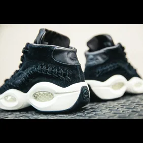 The shoe is constructed in a premium black nubuck upper with woven paneling referencing his braids, all in a deconstructed design with the usual padding removed to create a sleeker, lifestyle-minded silhouette. Further refinements to the Questions by Hall of Fame include leather lace gillies, inner lining, and sockliner, as well as embossed leather branding throughout. Additionally, every pair will also come with multiple lace options in Philly’s alternate uniform colors.