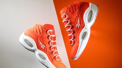 The beaming, atomic red Questions consist of an upper that is made of Kevlar fibers, a nod to A.I's toughness and resilience, and feature two of his other tattoos- a diamond and the aforementioned bulldog- on the base of each heel in place of the traditional #3.