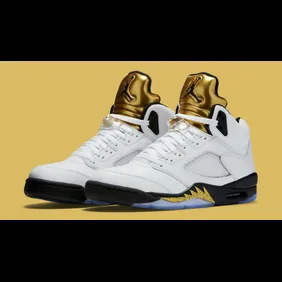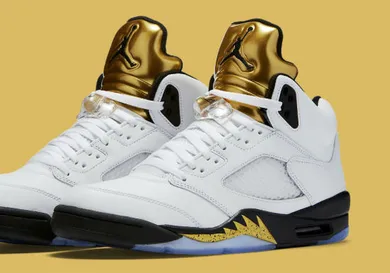 In celebration of the Summer Olympics in Rio, Jordan Brand is releasing this gold medal inspired "Olympic" aka "Gold Coin" Air Jordan 5 which we recently saw on the feet of Jimmy Butler at the Nike Air Hangar event in California.