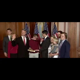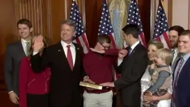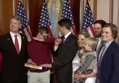 Ryan's first encounter with an attempted dab came yesterday when he was swearing in new Congressman Roger Marshall, a Republican from Kansas. Ryan was getting Marshall's family ready for a photo with him and a book, presumably the Constitution, when he noticed that one of Marshall's sons -- the boy holding the book -- was employing a peculiar pose. A clear, but nonetheless failed, attempt at a dab was underway, as the boy, whose name is Cal, had his left arm raised toward his face and had his nose leaning toward his elbow, as if he was about to sneeze.