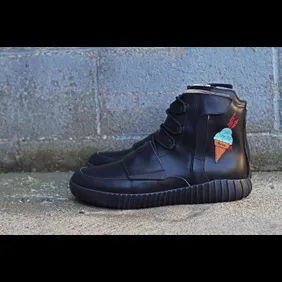 The kicks were constructed entirely out of black Essex oiled leather, which reportedly reflects blues and yellows dependent on the lighting. Of course, the Gucci Mane inspired customs also include a decorative ice cream cone logo, as well as a vegetable tanned leather, riri zippers, and carved leather stiffeners.