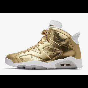 In addition to this gold Air Jordan 6, Jordan Brand will also be releasing a shiny metallic silver "Pinnacle" Air Jordan 1 Low and a bronze pair of slides, all of which honor the 25 year anniversary of Michael Jordan's first NBA title.
