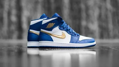 Appropriately dubbed "Olympic" the kicks feature a combination of white and deep royal blue on the leather upper with gold handling the swooshes and wings logo, while red adorns the jumpman logo on the tongue.