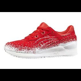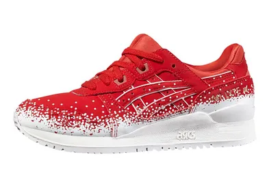 Featured in this wintery collection are two contrasting colorways- both of which lend itself to the Christmas spirit. On one hand, we have the red Santa-inspired Asics Gel Lyte 5 which is grounded by a snowy white mudguard and midsole. On the other hand, a minty green Gel Lyte 3 with a similar snowflake splatter design.