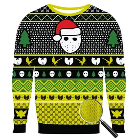 The sweater is 100% knit and features Wu-Tang logos throughout, as well as the requisite Christmas trees and some killer bees for good measure. The star of the show is Ghostface’s trademark hockey mask, which appears in the middle of the sweater with a Santa hat for holiday cheer.